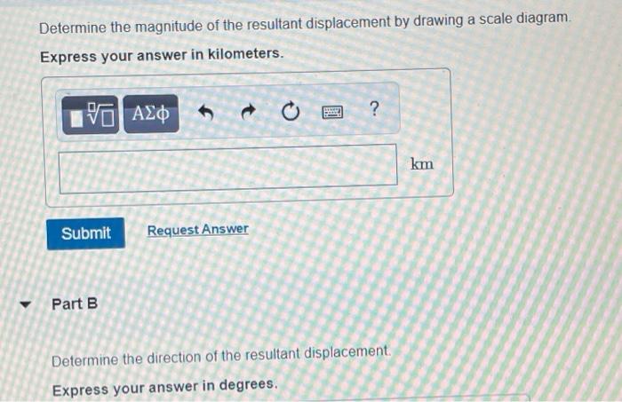 2143. This preview shows page 21 - 25 out of 43 pages. Part A Determine the magnitude of the resultant displacement by drawing a scale diagram. Express your answer using two significant figures. ANSWER: Correct 7.8 {\rm km} Part B Determine the direction of the resultant displacement.