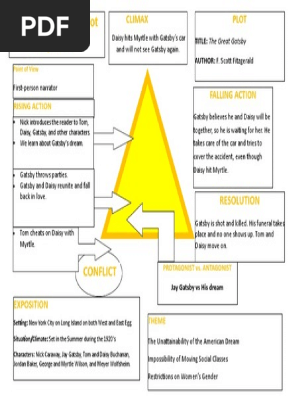Tom and Gatsby have a tense but understated showdown around who gets to control Daisy, and (surprise) Tom wins. He seals his victory by letting them drive home ... The Great Gatsby & Plot Points. As a lot of people have mentioned already, Fitzgerald’s choice to use a narrator whose story is not the main focus of the book is both revolutionary and maybe even the most appropriate choice for the story he wanted to tell. But, as some other people have mentioned, Nick is not devoid of his own narratives, no ... Get 24⁄7 customer support help when you place a homework help service order with us. We will guide you on how to place your essay help, proofreading and editing your draft – fixing the grammar, spelling, or formatting of your paper easily and cheaply. Create a visual plot diagram of The Great Gatsby. Click "Start Assignment". Separate the story into the Exposition, Conflict, Rising Action, Climax, Falling Action, and Resolution. Create an image that represents an important moment or set of events for each of the story components. Write a description of each of the steps in the plot diagram.