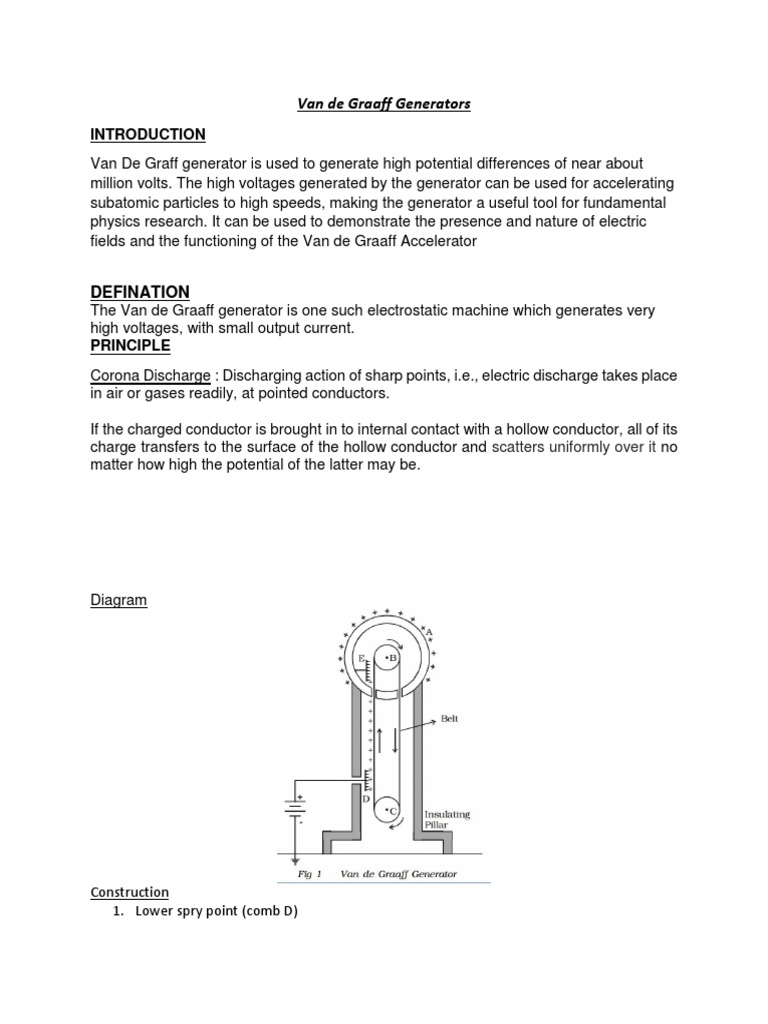 Access 130+ million publications and connect with 20+ million researchers. Join for free and gain visibility by uploading your research. A Van de Graaff generator is an electrostatic generator which uses a moving belt to accumulate an electric charge on a hollow metal globe on the top of an insulated column, creating very high electric potentials. It produces very high voltage direct current (DC) electricity at low current levels. A simple Van de Graaff generator consists of a ... the discharge wand and remove base cover of van de Graaff by removing the screws in the four rubber feet at the bottom of the base as shown in diagram 4. Do not remove the metal screws as those are holding posts to support the weight of the apparatus in place.-7-© EISCO SCIENTIFIC l www.eiscosci.com Diagram 4 Diagram 5 A Van de Graaff generator is an electrostatic generator, invented by an American physicist Robert J. Van de Graaff. It uses a moving belt that accumulates charge on a hollow metal structure designed like a globe, placed on the top of a column that is insulating in nature and thus, creating a very high electric potential in the order of a few million volts.