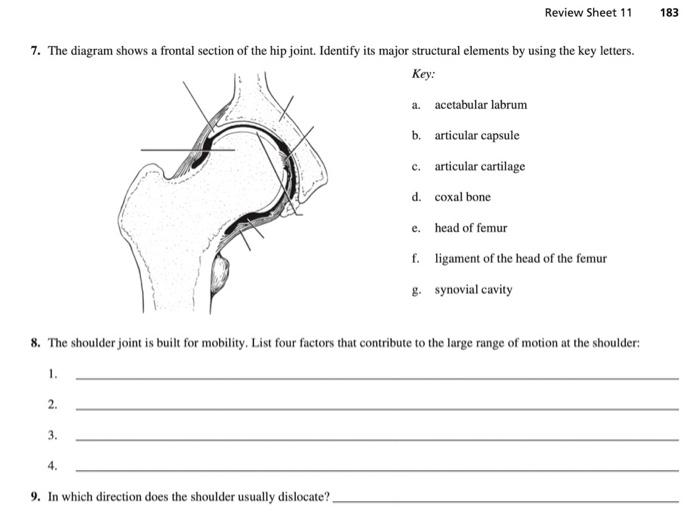 The diagram shows a frontal section of the hip joint. Identity its major structural elements by using the letters Key: a. acetabular labrum b. articular capsule c. articular cartilage d. head of femur e. hip bone f. joint cavity g. ligament of the bead of the femur The shoulder joint is built for mobility.