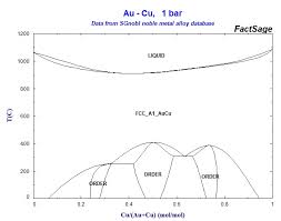 Phase equilibria have been extrapolated to low temperatures, and a condensed phase diagram has been plotted for the Au–Cu system to be consistent with the ... **[Gold Rundown:](http://i.imgur.com/FjcyE.png)** Valence: +1 Crystal Structure: [FCC](http://en.wikipedia.org/wiki/Cubic_crystal_system#Cubic_space_groups) Density: 19.32 g/cc Melting Point: 1064^o C Thermal Conductivity: 317 W/m-K Elastic Modulus: 78 GPa Coefficient of Thermal Expansion: 13.93 microns/^o C Electrical Resistivity: 2.35 micro Ohms-cm Cost: $44,542/kg as of January 12, 2011 at 11:30pm Eastern Time Gold has the highest electronegativity of all metals, 2.4 Paulings. All o... TDmeph IRSN Mephista nuclear database (0) TDnucl IRSN Nuclea nuclear database (0) SpMCBN Spencer Group M-C-N-B-Si alloys (837) Figure 4 presents the predicted nano-phase diagrams of Cu-Au alloy with different shapes in terms of Eqs (1) and (3)-(7), at two sizes of 10 and 4 nm. The bulk phase diagram is also calculated ...