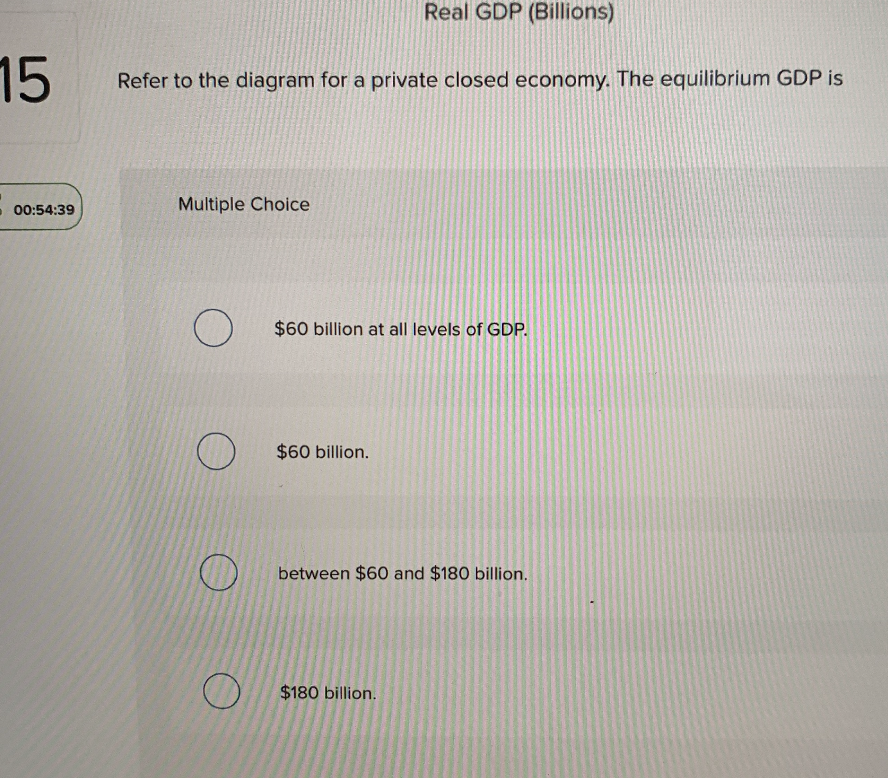 Refer to the diagram for a private closed economy. At the equilibrium level of GDP, investment and saving are both: $50. $100. $20. $40. (picture on phone). Transcribed image text: Real GDP (Billions) 15 Refer to the diagram for a private closed economy. The equilibrium GDP is 00:54:39 Multiple Choice O $60 billion at all levels of GDP. $60 billion. between $60 and $180 billion. O $180 billion.
