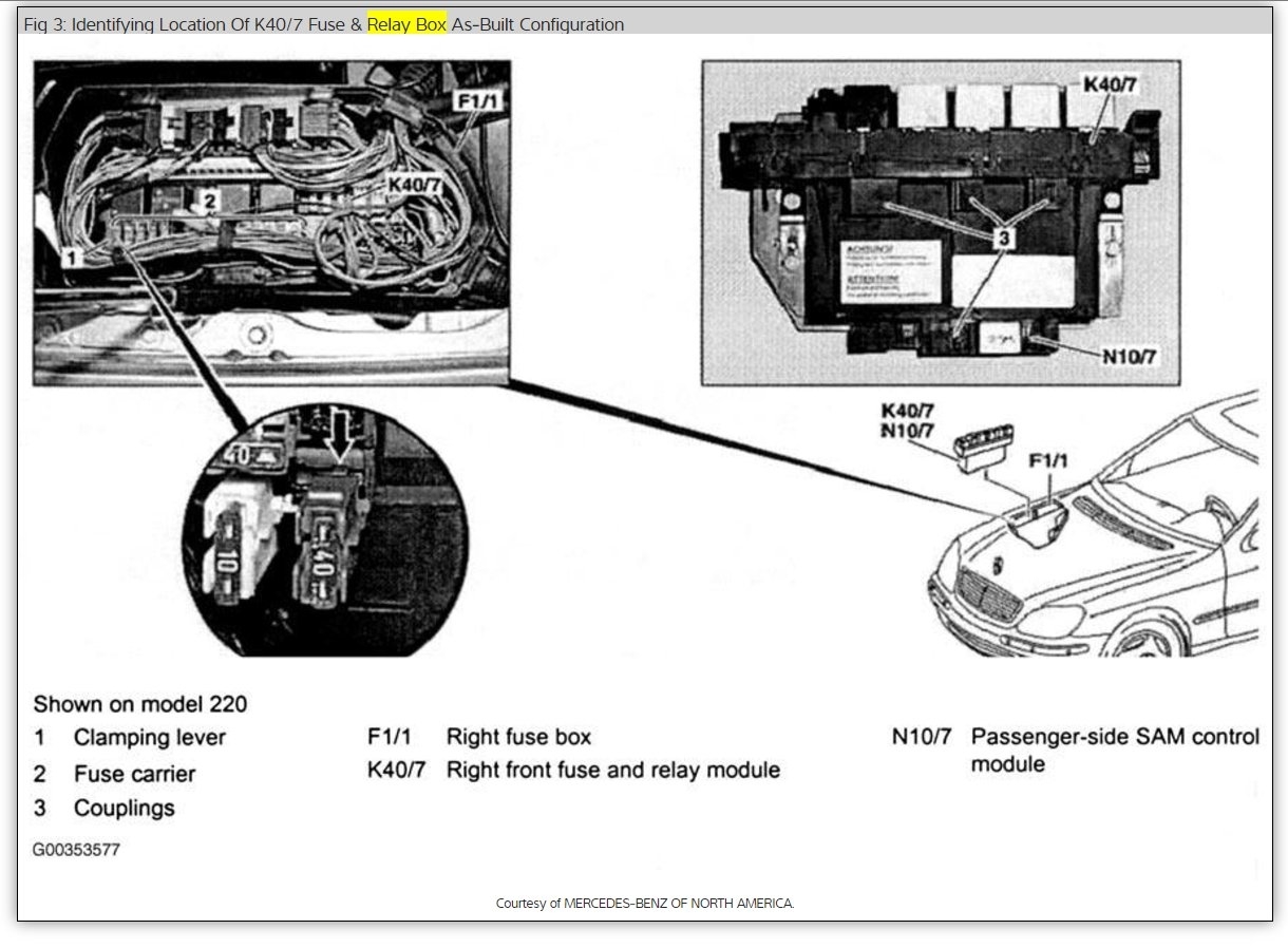 S CL Class W220 Fuses and Relays Location Designation 2000-2006. Look up the fuse assignment and relays for the S and CL Class. If you find a blown fuse, replace it with the same color. The S and CL class use the fuse types shown here.If you need the right fuses type for your Mercedes , you can order a box of 120 fuses for less than $10 on ...