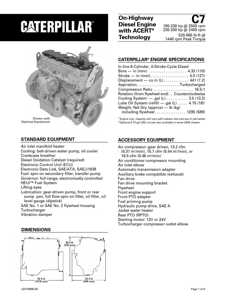 CAT C7.1 engine sales manual,238 Pages - Click to download CATERPILLAR C7 key engine bolt tightening torques and specs Click to get CAT C7 key bolt torques and engine specs. X Diesel Engine Specs. Basic specs are free and open to everyone. They usually include engine images, displacement, dimensions and weight, essential bolt tightening torques, plus characteristics of the engine e.g. its ...
