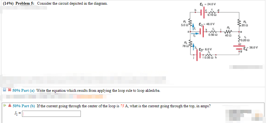 This problem has been solved! Consider the circuit depicted in the diagram. (a) Write the equation which results from applying the loop rule to loop akledcba. (b) If the current going through the center of the loop is 65 A, what is the current going through the top, in amps?