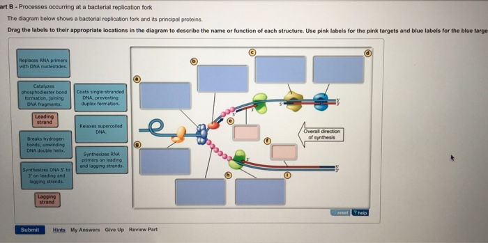 The diagram below shows a bacterial replication fork and its principal proteins. Drag the labels to their appropriate locations in the diagram to describe the name or function of each structure. Use pink labels for the pink targets and blue labels for the blue targets. View Available Hint (s) Reset Help Synthesizes RNA primers on leading and ... The diagram below shows a bacterial replication fork and its principal proteins. Drag the labels to their appropriate locations in the diagram to describe the name or function of each structure. Use pink labels for the pink targets and blue labels for the blue targets The diagram below shows a bacterial replication fork and its principal proteins. Drag the labels to their appropriate locations in the diagram to describe the name or function of each structure. (h)