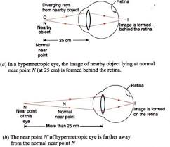 Draw ray diagrams of a farsighted eye looking at an object that is very far away and another object that is very close. Draw the ray diagram for nearsighted people to converge the parallel incoming rays and label where the image will be. Explain what kind of corrective lens you should use. In drawing a ray diagram rays can be drawn.