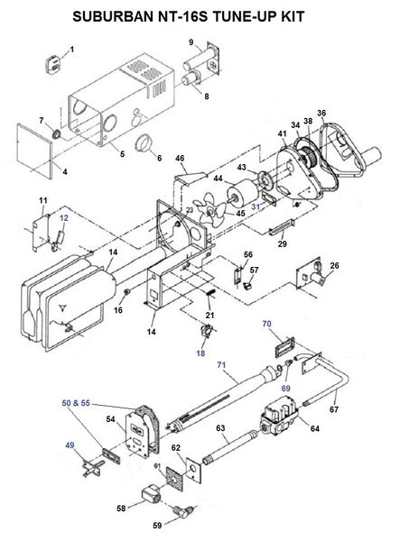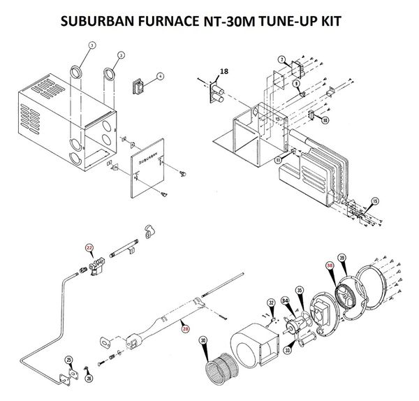 Suburban Furnace Model NT-30M Tune-Up Kit. Tune-Up Kit Contents ( links in blue ): Item# 9 Fan Switch 230575. Item# 11 Limit Switch 230496. Item# 15 Electrode, Dual Sense 520733. *Not Shown* Electrode / Burner Door Gasket Kit 071076. Item# 26 Orifice 180214. Item# 32 Sail Switch 230509 (New P# 233356)