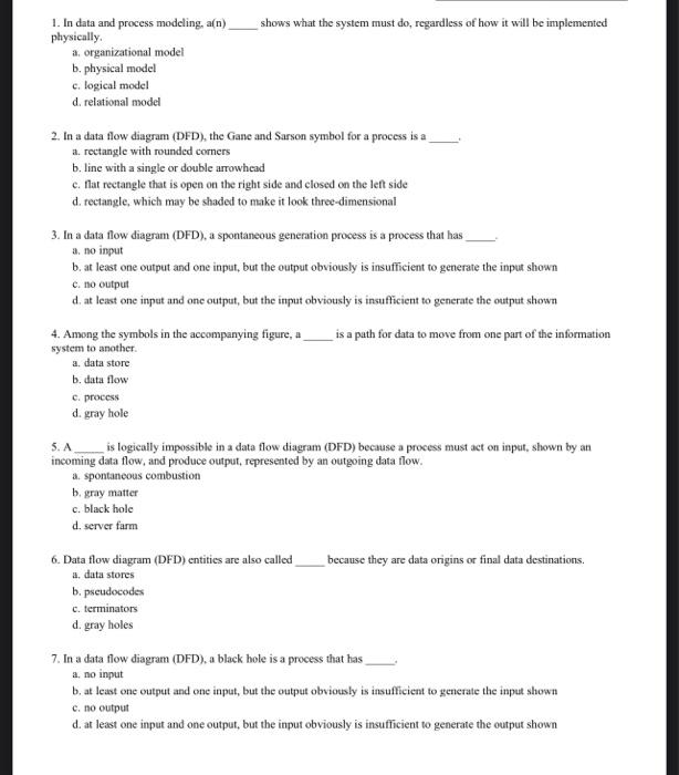 ___ is/are logically impossible in a DFD because a process must act on input, shown by incoming data flow, and produce output, represented by an outgoing data flow. a. Spontaneous combustion b. Gray matter c. Black holes d. Black boxes Answer: C