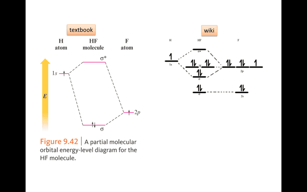 Draw the molecular orbital diagram for HF. Hydrogen Fluoride Hydrogen fluoride is an ionic compound that is formed by hydrogen and the most electronegative atom fluorine. Construct the molecular orbital diagram for HF. Use only the valence electrons for your diagram. The 2s orbital of F atom has an energy more than 26 eV lower than that of the H 1s, so there is very little interaction between them. The F 2p orbital (-18.65 eV) and the H 1s (-13.61 eV), on the other hand, have similar energies, allowing them to.
