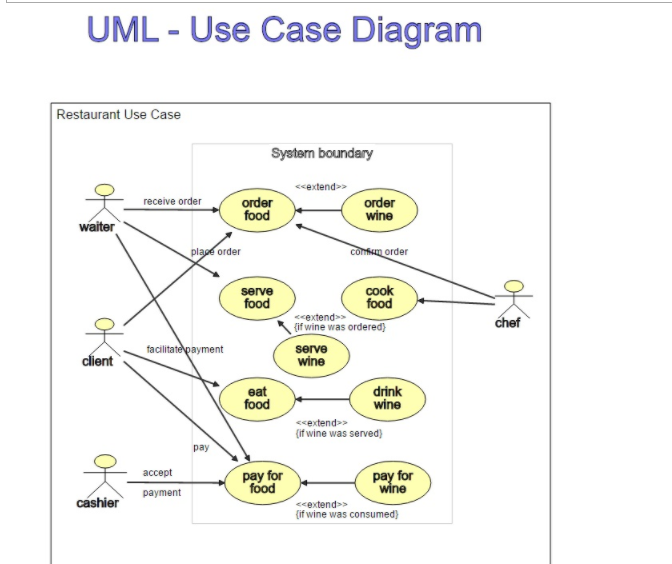 Use case behaviors may be described in a natural language text, which is current common practice, or by using UML behavior diagrams for specific behaviors such as: activity, state machine, and; interaction. For this week's Critical Thinking Assignment, you are asked to create a business use case diagram for a restaurant.