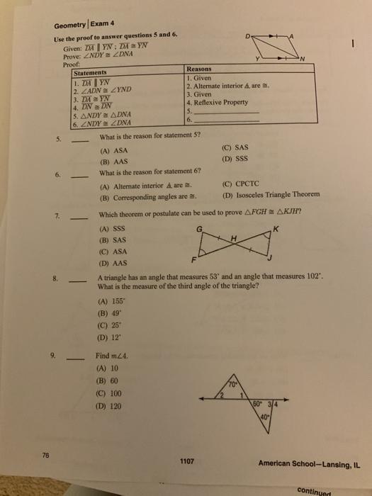 The diagram is not to scale. 105° 72° x ° a. 33 b. 162 c. 147 d. 75 ____ 4. The folding chair has different settings that change the angles formed by its parts. Suppose is 26 and is 70. Find . The diagram is not to scale. 1 2 3 a. 96 b. 106 c. 116 d. 86 ____ 5. Find the value of x. The diagram is not to scale. Given:, , use the diagram and information to complete the proof. the following table shows steps 1 through 5 of the proof. for steps 6 through 11, match each numbered statement with the correct reason. 6. segment addition postulate. 7. substitution property of equality. 8. reflexive property of congruence. Use the diagram to complete the proof by filling in the blanks. Picture is attached - 17400232