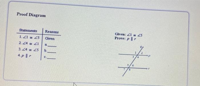 18 Oct 2021 — Use the proof diagram to complete the question. state the missing reason in this proof for the letter given. c. 29 Sept 2021 — How many milliliters of alcohol are present in 700mL of brandy? geometry. Supply the missing reasons to complete the proof Given: B congruent E ...4 answers · Top answer: Here are the answers for the Proving Lines Parallel Quiz 100% (except for 4. and 7.) 1. 2 ... Use the proof diagram to complete the question. State the missing reason in this proof for the letter given. Mathematics. Answer Comment. 1 answer: Hatshy [7] 7 months ago. 5 0. Answer: See below. Step-by-step explanation: We know that and we want to prove that . 24 Jan 2020 — answers to question: Use the proof diagram to complete the question. state the missing reason in this proof for the letter given. c.2 answers · 2 votes: Statements | Reasons1. | Given2. | As vertical angles3. | According to steps 1 and 2: 4. | ∠4 an...