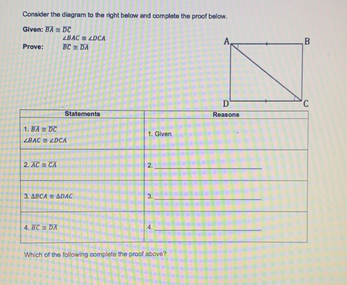 use the following diagram and information to complete the proof. given: abcd is a rectangle prove: the diagonals ac and bd are congruent match each numbered statement for steps 3 through 7 with the correct reason. Answer to Solved B 17. Proof Complete the proof. A GIVEN: AB || CD, AB Correct answer to the question Use the following diagram and information to complete the proof. Given: ABCD is a rectangle. Prove: The diagonals AC ... Angle 1 is congruent to angle 3. Prove: Angle 2 is congruent to angle 3 Write a two-column proof . geometry. Supply the missing reasons to complete the proof Given: B congruent E and BC congruent to EC Prove: AC congruent to DC . You can view more similar questions or ask a new question.