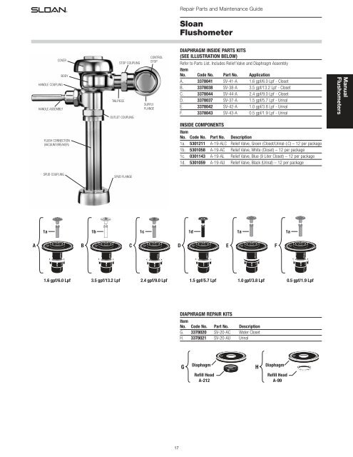 Code No. 0816558 — Rev. 3 (02/15) INSTALLATION INSTRUCTIONS FOR EXPOSED SLOAN . WATER CLOSET AND URINAL FLUSHOMETERS. LIMITED WARRANTY. Unless otherwise noted, Sloan Valve Company warrants this product, manufactured and sold for commercial or industrial uses, to be free from defects in material and workmanship for a Part #Part DetailsPrice1Sloan Regal R‑10 Cover Item #: 107447 Learn MoreList Price: $30.40 $24.32 You S...2Sloan A‑71 Inside Cover Item #: 101278 Learn MoreList Price: $9.30 $7.00 You Sav...3Sloan A‑19 Flushometer Relief Valves Learn MoreMore InfoView 41 more rows 10. Sloan F-5-A Flushometer Spud Coupling Assembly for 1-1/2" Toilet Vacuum Breaker Item #: 101287 Learn More. List Price: $18.25. $15.51. You Save 15%. Add to Cart. 11. Sloan V-651-A High Back Pressure Vacuum Breaker Repair Kit Item #: 101288 Learn More.