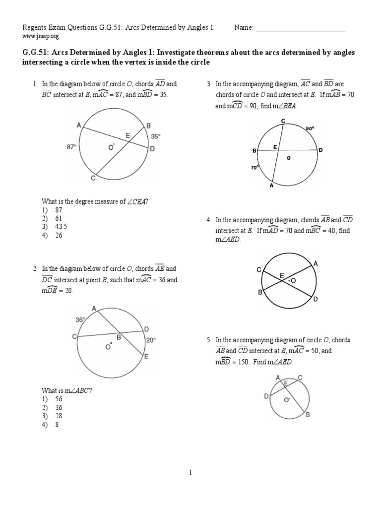 Regents Exam Questions G.C.A.2: Chords, Secants and Tangents 10 Name: _____ www.jmap.org 2 5 In the accompanying diagram, chords AB and CD intersect at E.If mAD =70 and mBC =40, find m∠AED. 6 In the accompanying diagram of circle O, chords AB and CD intersect at E, mAC =50, and mBD =150. Find m∠AED. 7 In the accompanying diagram, AB is a diameter of