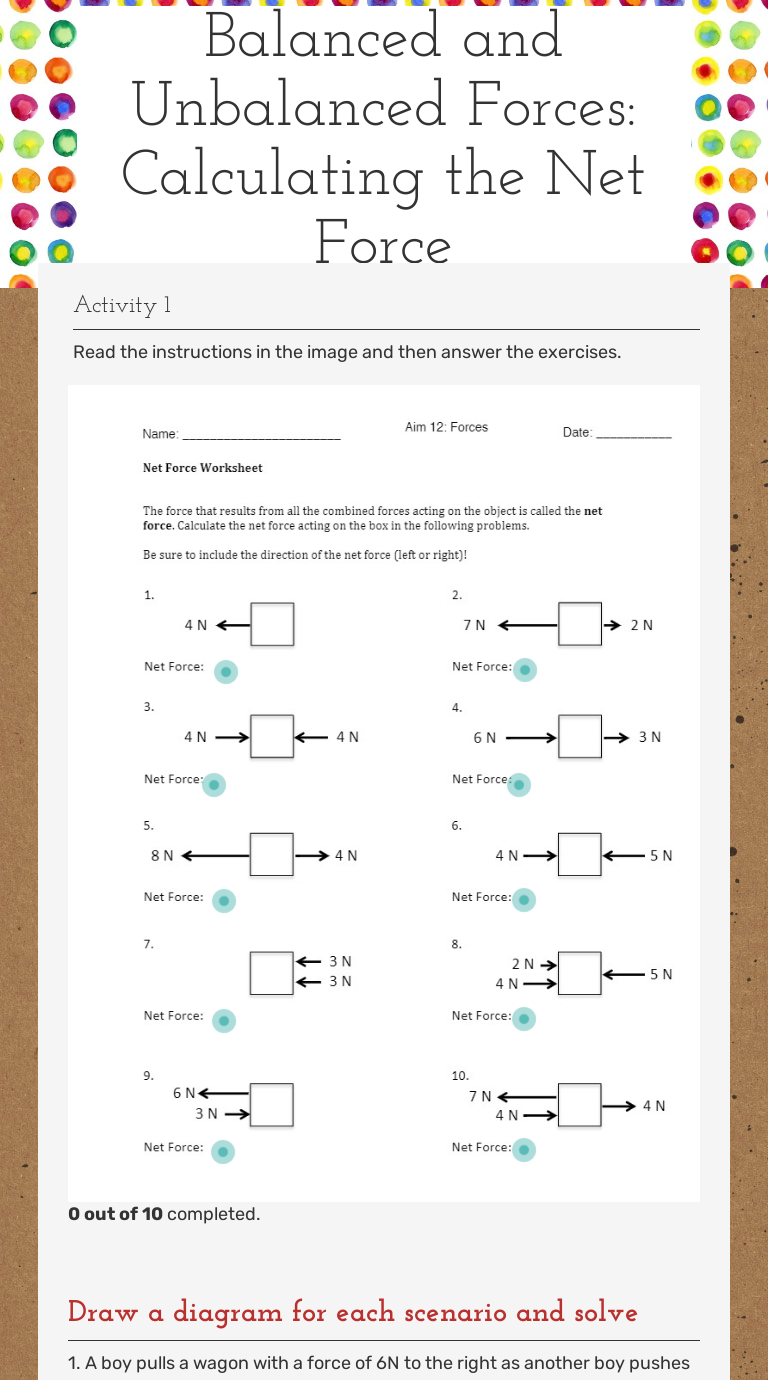 PDF Calculating Net Forces - Examples - STEAM Calculating Net Forces - Examples Interpret each drawing of forces on the box. Calculate and write the resulting net force on the blank below the box (make sure to include the correct unit of measure). On the next blank, write the word balanced or unbalanced and circle the arrow for the direction of the resulting net force.