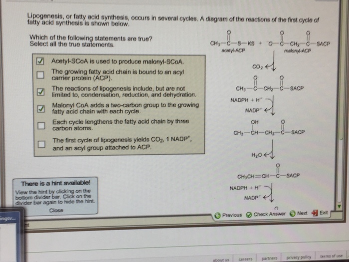 MCB: Exam 4 Sapling Flashcards - Quizlet Lipogenesis, or fatty acid synthesis, occurs in several cycles. A diagram of the reactions of the first cycle of fatty acid synthesis is shown. Select all of the true statements. Malonyl‑CoA adds a two‑carbon group to the growing fatty acid chain with each cycle. The reactions of lipogenesis include, but are not limited to, two reductions and a dehydration. Acetyl‑SCoA is …