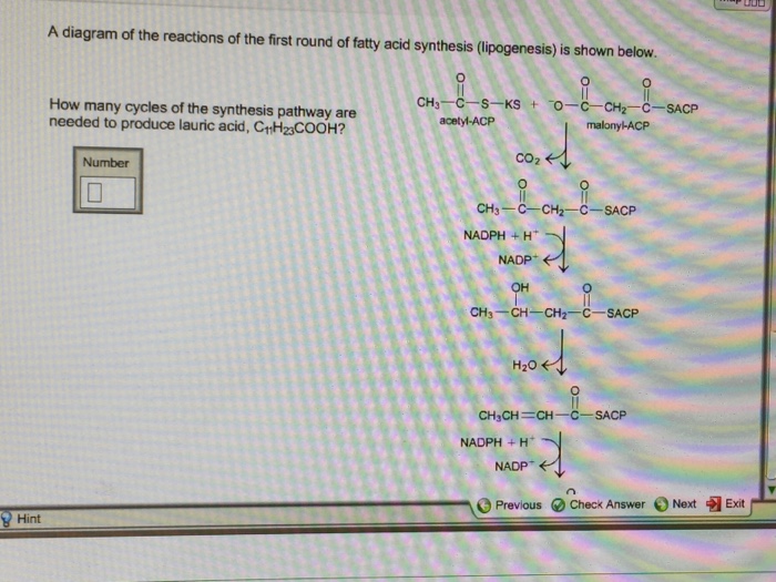Solved A diagram of the reactions of the first round of ... Science. Chemistry. Chemistry questions and answers. A diagram of the reactions of the first round of fatty acid synthesis (lipogenesis)is shown below. How many cycles of the synthesis pathway are needed to produce lauric acid, C11H23COOH? Question: A diagram of the reactions of the first round of fatty acid synthesis (lipogenesis)is shown below.