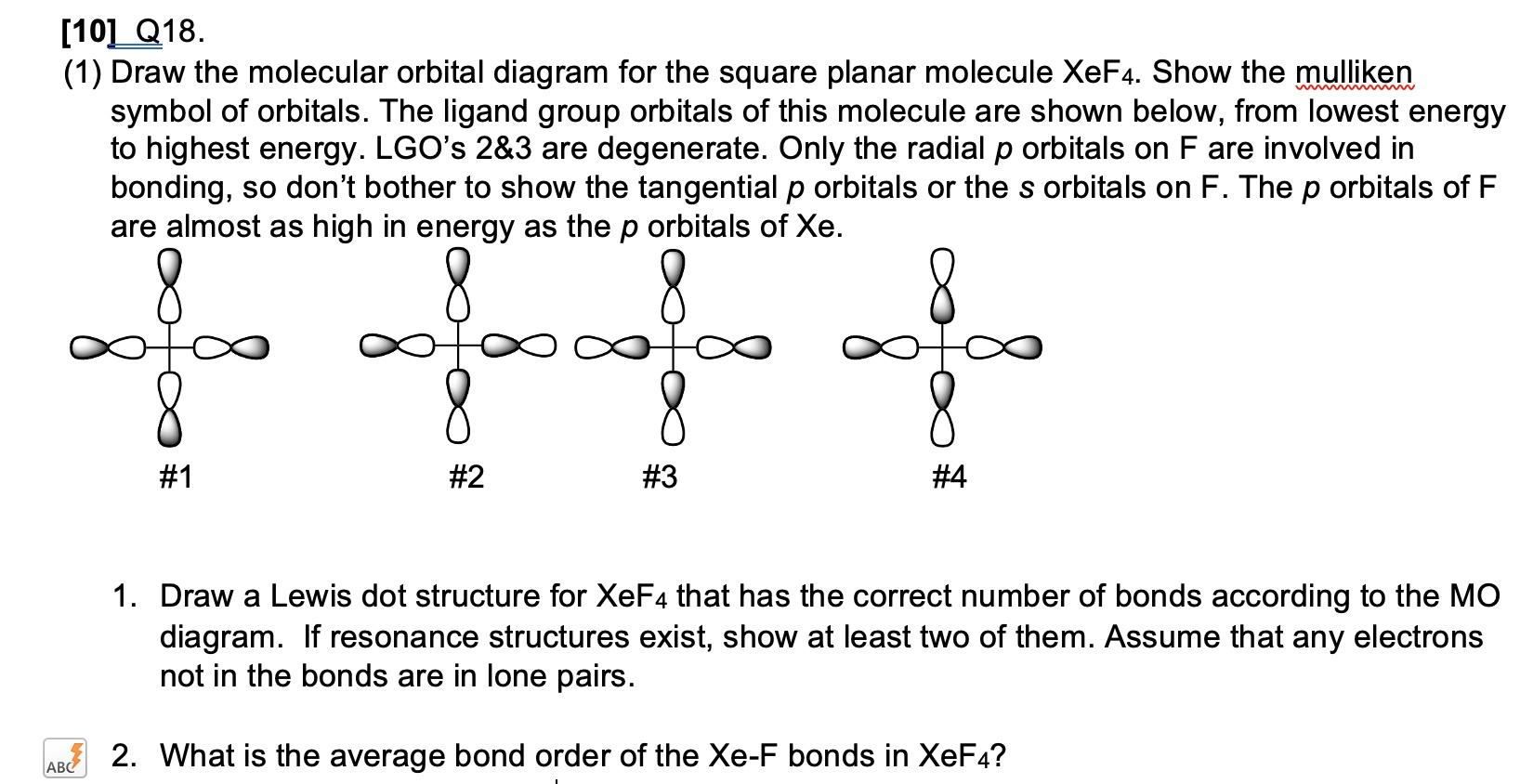 Solved Q18. (a) Draw the molecular orbital diagram for the ... (a) Draw the molecular orbital diagram for the square planar molecule XeF4. Show the mulliken symbol of orbitals. The ligand group orbitals of this molecule are shown below, from lowest energy to highest energy. LGO's 2&3 are degenerate. Only the radial p orbitals on F are involved in bonding, so don't bother to show the tangential p ...