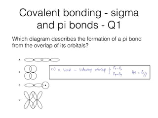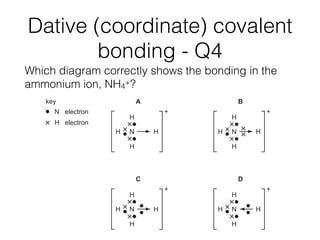 A. a covalent bond B. a coordinate covalent bond C. a hydrogen bond D. an ionic bond 11. Which compound contains a bond with the least ionic character? A. CO B. CaO C. K2O D. Li2O 12. Which type of bonds are formed when calcium atoms react with oxygen atoms? A. polar covalent B. coordinate covalent C. ionic D. hydrogen 13. 43. ionic bonds and polar covalent bonds/covalent and ionic 44. BaCl2 45. 46. 47. Lewis electron-dot diagrams only show valence electrons, which are involved in bonding. 48. Examples: --The total mass of reactants equals the total mass of product. --Mass of reactants equals mass of product.--Mass is conserved. 49. Examples ... Question 8. SURVEY. 30 seconds. Q. The diagram above shows a block from the periodic table. The number six represents the —. answer choices. atomic mass of the element carbon. number of valence electrons in the element carbon. a) hydrogen b) coordinate covalent c) polar covalent d) ionic 10) Which type of bond is formed by the transfer of electrons from one atom to another? a) an ionic bond c) a covalent bond b) a hydrogen bond d) a coordinate covalent bond 11) Which atoms are most likely to form covalent bonds?