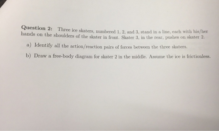 Draw A Freebody Diagram For Skater 2 In The Middle - Free Wiring... To draw a proper free body diagram you must follow these steps. Skater 3 at the rear pushes on skater 2. Assume the ice is frictionlessdraw a freebody Draw a free body diagram for skater 2 in the middle. Draw vector location correct length and orientation of the vectors thank you lifesaver.