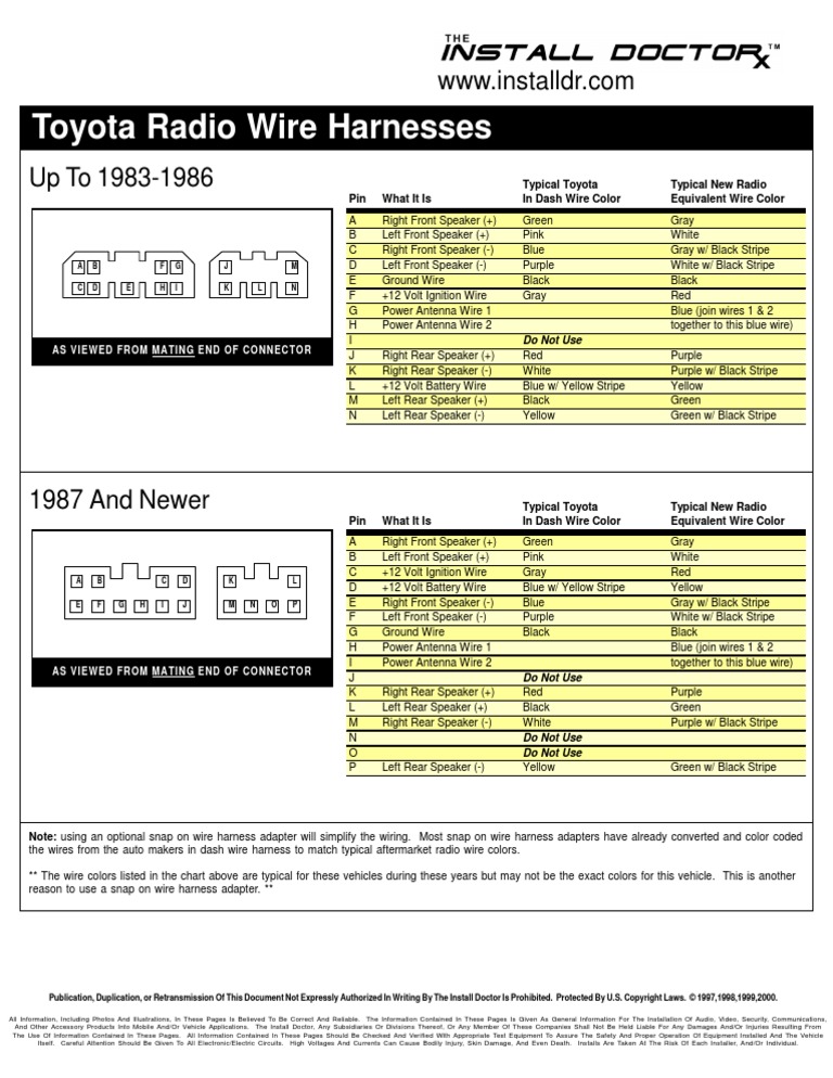 Toyota Corolla Radio Wiring Color Codes Toyota Corolla stereo wire harness → amzn.to/2fjFc4V This video is about how to wire new stereo to the factory stereo wires. toyota camry stereo wiring diagram 12 volt constant ( blue with yellow stripe ) 12 volt ignition switched ( thinner gray wire ) ground ...